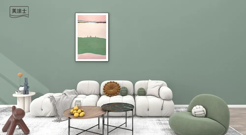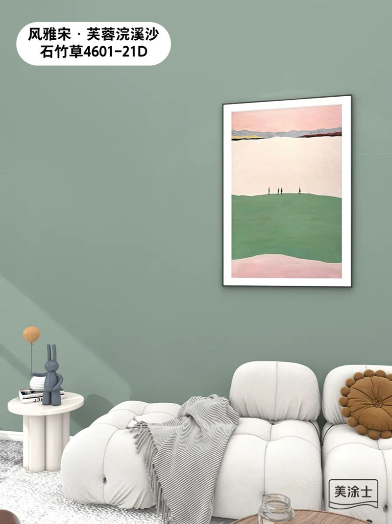 彩乐园国潮色天鹅绒苔藓绿MTR038,淡淡的复古绿色在流连的光影中波光琉璃,搭配纯色软装,以及亮色门框,一深一浅,一明一暗,增强了空间的和谐度。亮金色装饰架作为空间中的点缀色,营造出奢而不俗的现代典雅氛围感。