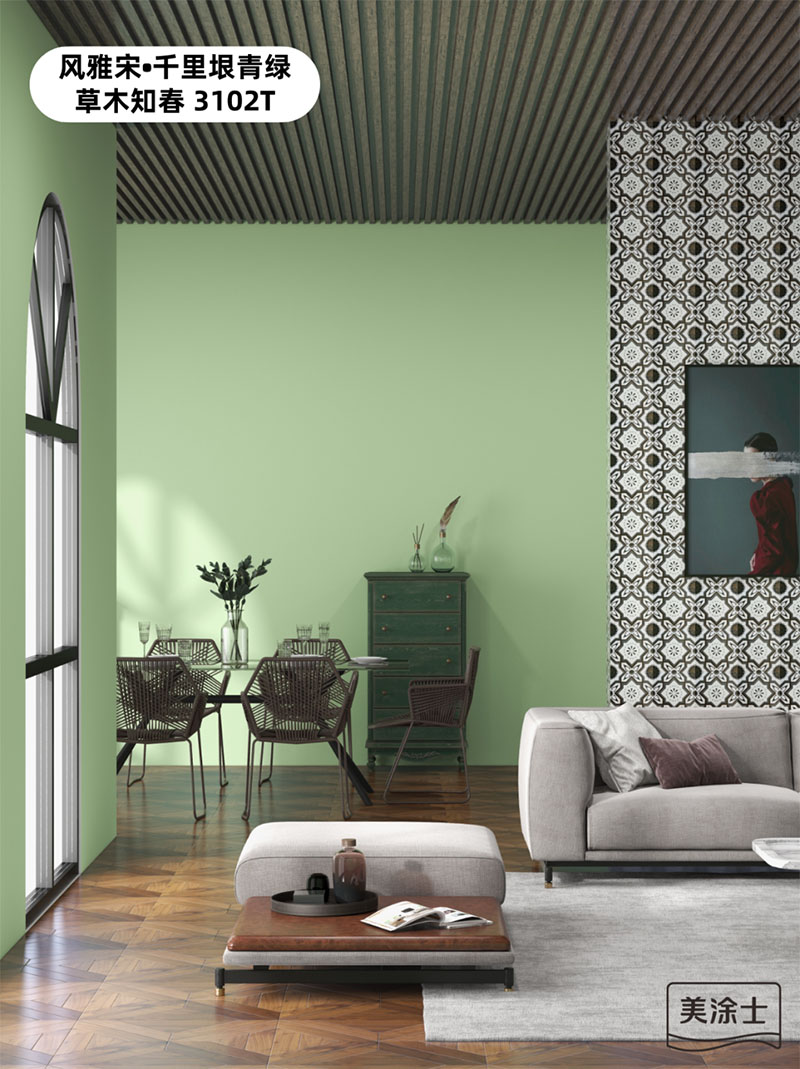 彩乐园国潮色草木知春3102T,弱化了复古绿的陈旧感,强化了空间的时髦感,与灰白软装的搭配,一明一暗的对比,一冷一暖的融合,奢华的质感与复古的气息碰撞,勾勒出低调的高级时尚感,让空间的气场和颜值达到峰值。