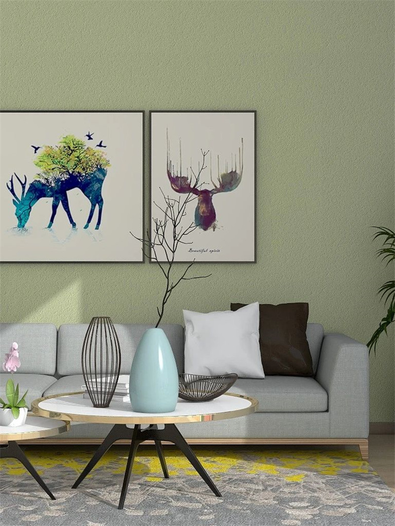 用彩乐园微晶石打造的浅绿色背景墙,搭配白色简约的装饰挂画和灰色的沙发,低调而不张扬。加上绿植,更显整个空间清新自然。