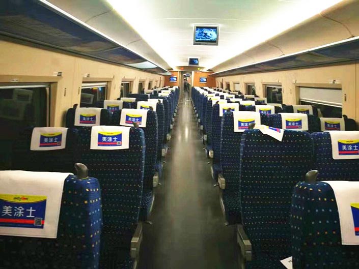 不仅仅只是在高铁车厢的座椅头枕上,在京广深段高铁沿线主要城市,彩乐园亦投放了高铁站内LED大屏广告与站台动态灯箱广告。除此之外,彩乐园还斥重金在京广深路线列车以及沪汉蓉线《火车》杂志上打造彩乐园品牌形象;覆盖广东、湖南、湖北、河南、河北、北京、辽宁、福建、黑龙江等多个省份城市运行区间的高铁列车,将彩乐园崇尚健康安心的生活方式和打造环保涂料的理念传达给数以亿计的乘客,共同见证彩乐园雄厚的品牌实力。