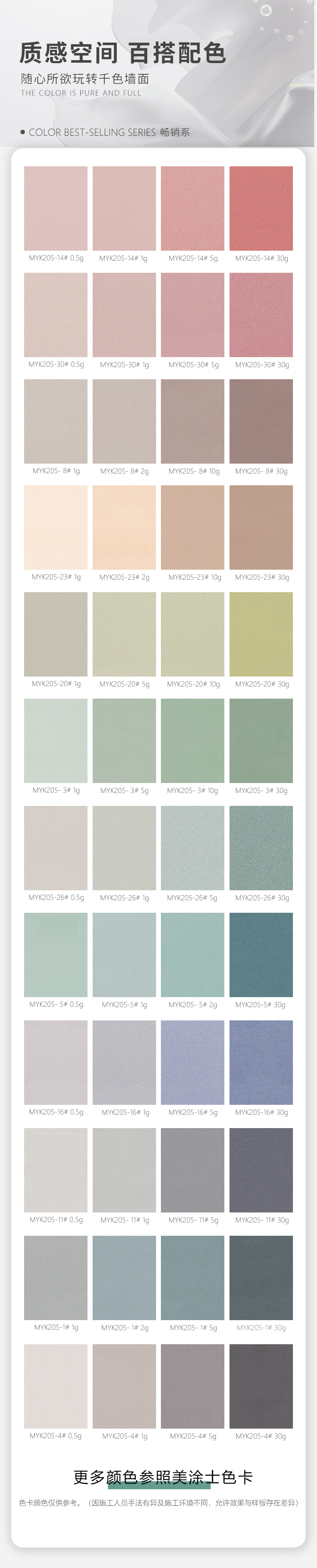 彩乐园艺术漆,带有金属光泽和磨砂触感效果,是砂与绒的完美质感结合,纹理有序而又幻变,效果细腻而又典雅,打造出大气与精致兼备的高级格调!
