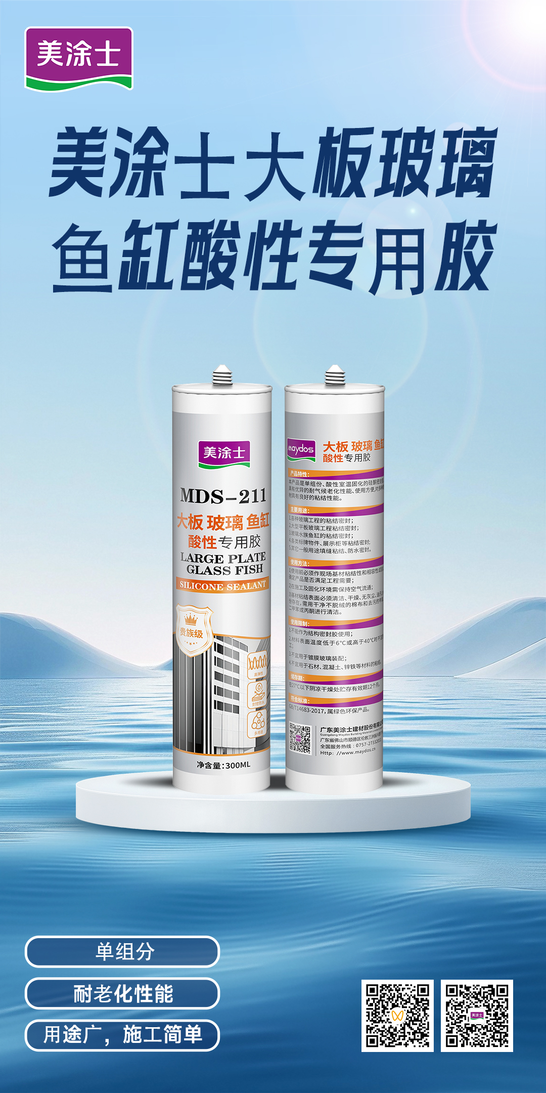 系酸性、室温固化的单组分耐候硅酮密封胶,挤出后与空气中的水汽发生反应,固化后形成具有耐寒、耐热、无腐蚀、干燥速度快、环保无醛的高强粘结力弹性体,对玻璃、陶瓷、木材等具有优异的粘接性。